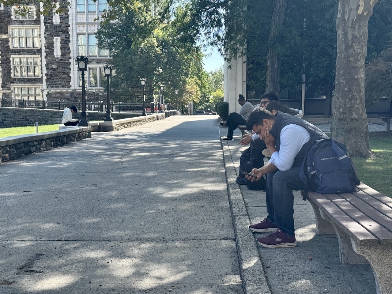 Students sitting alone on The City College of New York campus.